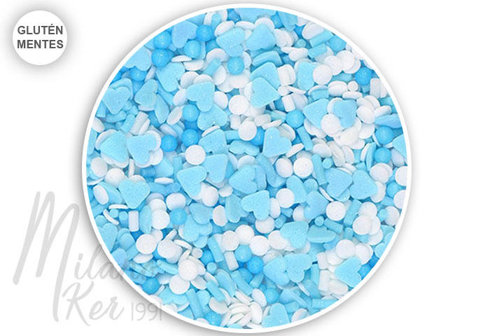 • Öt féle, kék-fehér színű (kék: szív, gömb, rúd; fehér: kör, rúd vegyesen)  szórócukor mix