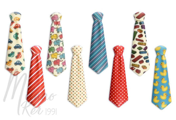 Fehércsokoládé nyakkendők, nyolc féle (autók, építőkockák, kacsák, elefántok, csíkos, pöttyös) mintával vegyesen
